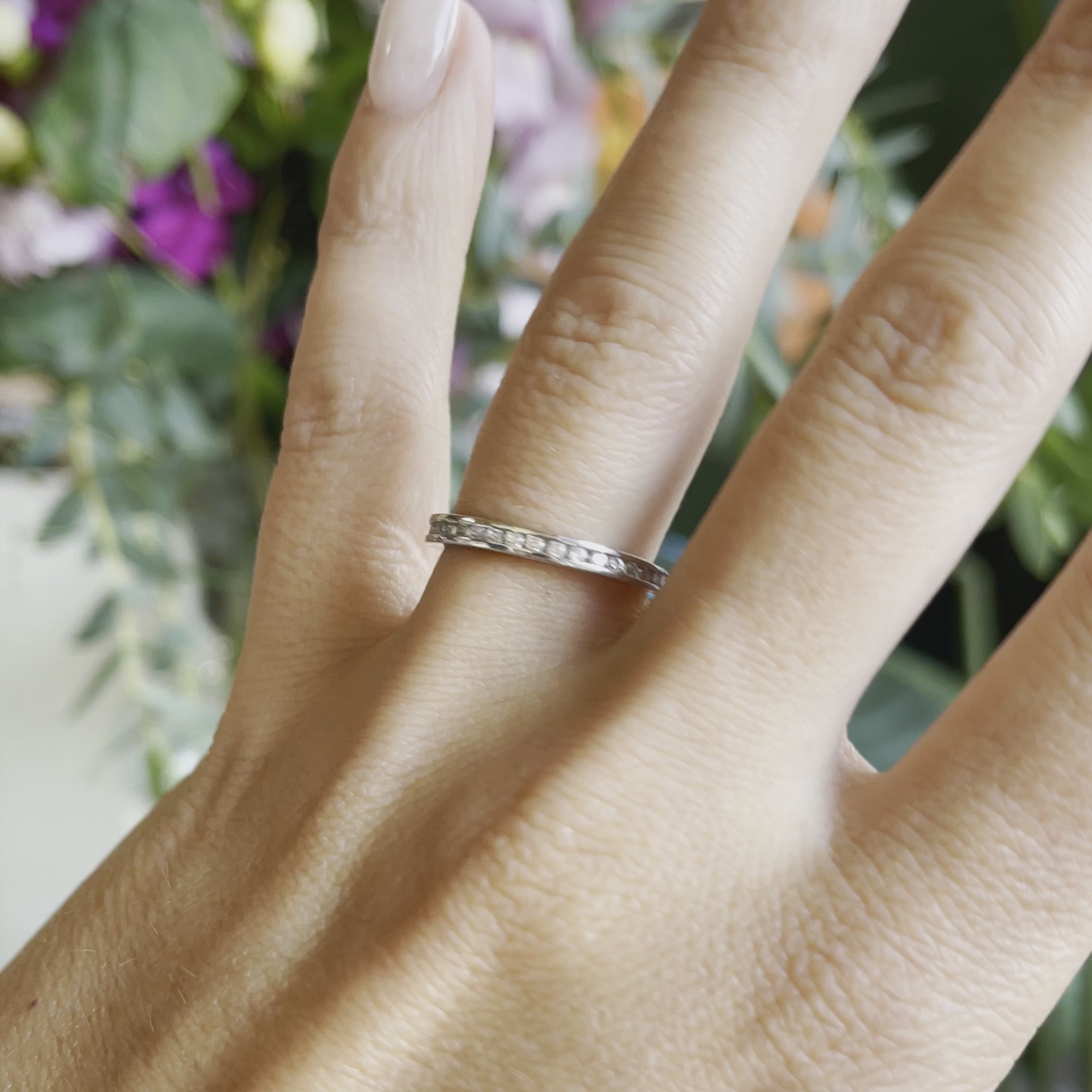 - Features stunning round-cut stones, set in a beautiful channel setting that span the entire circumference of the band.